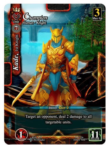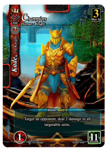 Abandoned as a child, Kade grew up in Salthe, a town east of Kagrath while trained by Captain Tyler. Captain Tyler, who trained skilled younglings recruiting them to the kingdom's army, molded Kade as a cunning assassin. After joining the Tournament of Champions, Kade proved worthy and joined the king's guard.